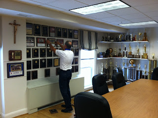 | DeMatha Athletic Director Ed King adjusts a fallen plaque. DeMatha keeps extra trophies in a private building. (Tyler Barto) |